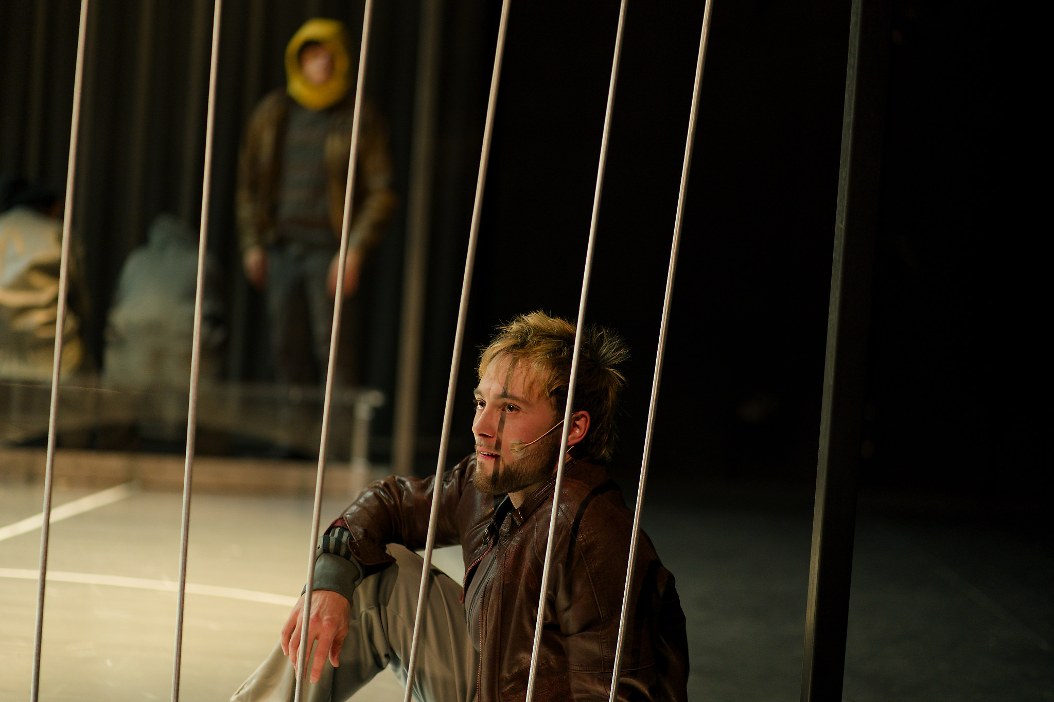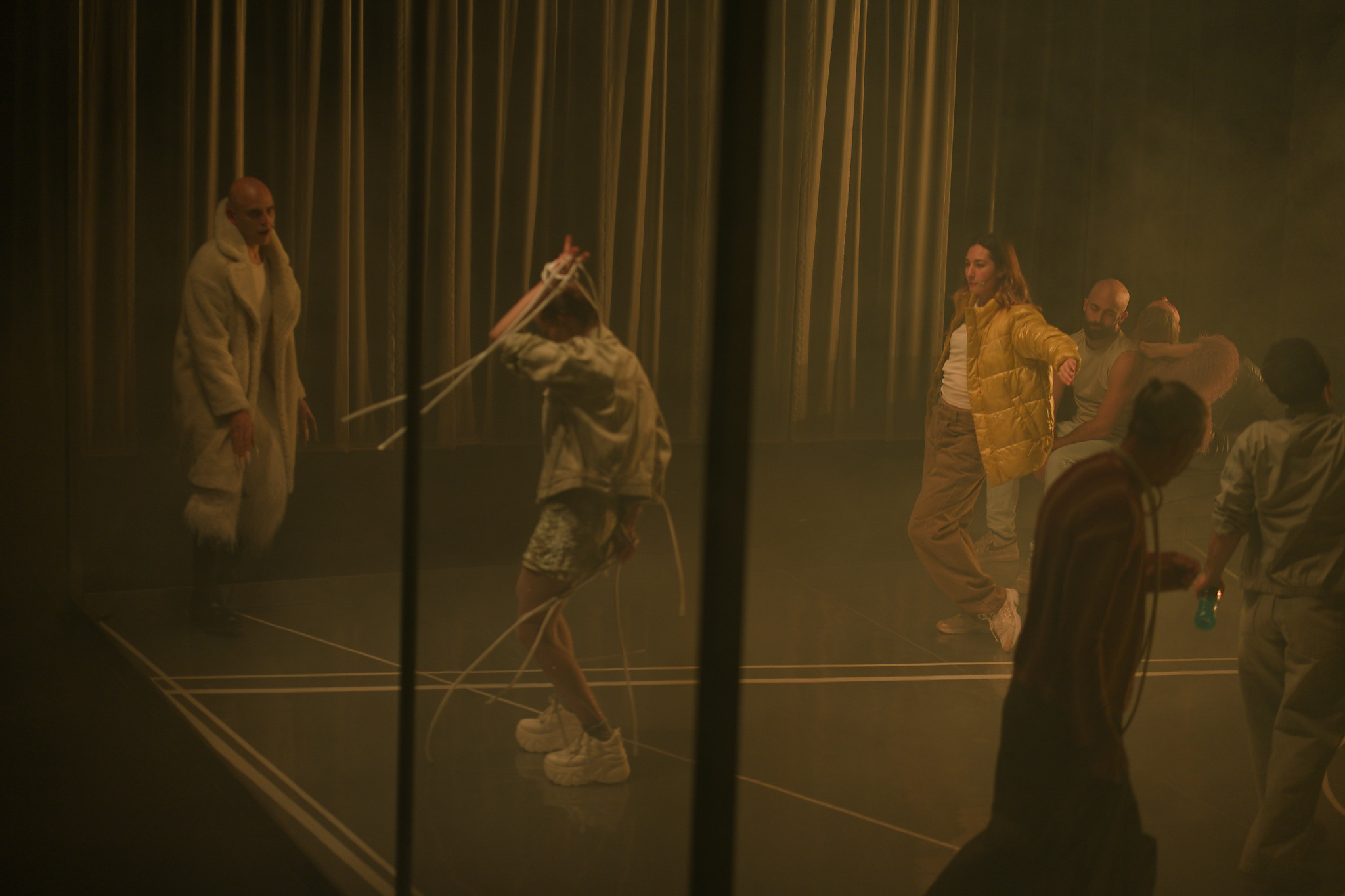 Les personnages sur scène jouent dans une grande cage transparente.